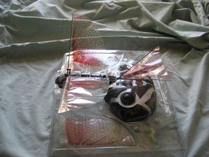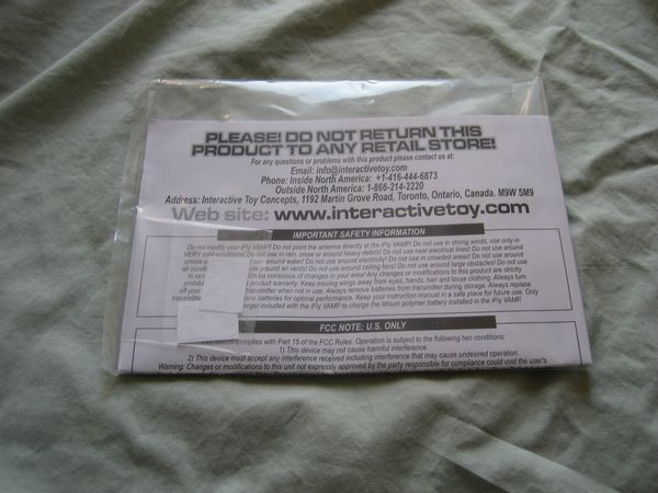 The iFly Vamp is encased in two formed pieces of plastic to keep it safe during transport. Included in the box besides the RC toy and remote is the antenna, an extra set of wings, a package of adhesives and the instructions.