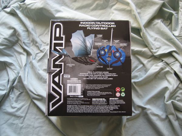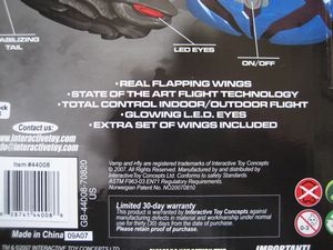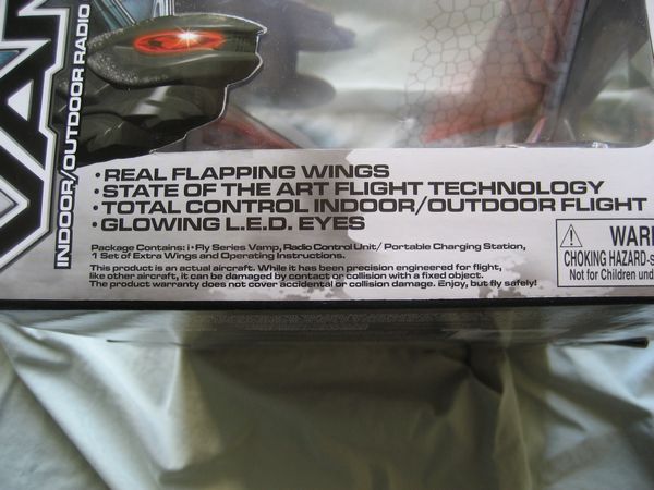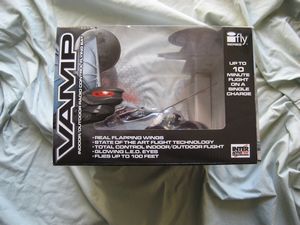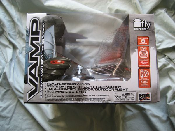 An Ornithopter differs from all man-made flying devices in that it flaps its wings to propel itself through the air. This is a form of flight that most resembles the natural abilities of birds. The i-Fly VAMP is styled to resemble a fantasy-inspired bat. At 12 in width and 10 in length it is the worlds smallest radio-controlled ornithopter in the form of a bat. The flapping wings mimic the behavior of a bird or an insect, giving the eerie illusion that the toy is alive when it is in flight. In addition, the ability to control the i-Fly VAMP through the use of a digital proportional radio controller gives the illusion that the VAMP flies along an intelligent path. The glowing eyes of the i-Fly VAMP add to its mystique as a supernatural nocturnal creature.