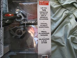 The iFly Vamp Radio Control Ornithopter arrives in a 10 x 12 x 7 cardboard box with a clear window on the front, top and bottom which displays the Vamp and remote, which are centered in the middle.