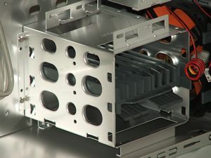 Inside we also find an accessory box with screws, zipties and the back I/O plate. There are four 5'25” bays and six 3.5” bays. Two of the 3.5” bays are accessible from the front of the case, one is located under the USB ports and the other under the 5.25” drive bays. Inside the hard drive cage is where the drive rails are located for storage.