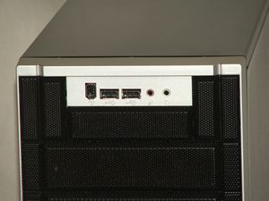The top of the front bezel is where the USB, Firewire and audio ports are located, and on the bottom is where you'll find the power and reset buttons along with LEDs for power and hdd activity. You can also see the pre-installed front cooling fan as well.
