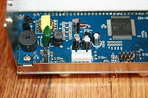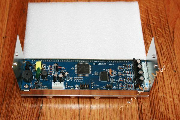 The rear panel circuit board features a warning beep speaker, a jumper for this speaker, a power connector, a connector for the temperature sensors, a jumper for Celcius/Fahnrenheit and a connector for the fan cables.