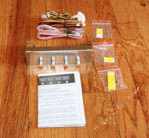 Upon opening the box, one is greeted by a soft foam protector box which holds the KazeMaster, four temperature probe cables, four fan connector cables, a molex power connector, screws, adhesives, instructions and a fan molex adapter.