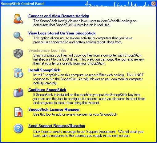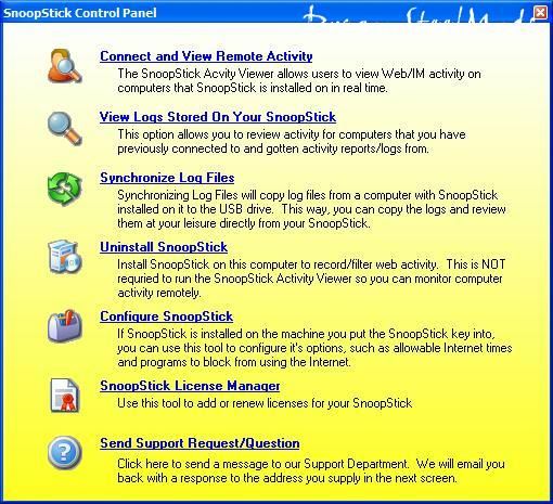 Starting the SnoopStick software will take you to the SnoopStick Control Panel, where you’ll have quite a few options. You’ll notice one of them is darkened out, it is only available if the actual ‘Snooping’ software is installed on the computer you inserted the SnoopStick into.