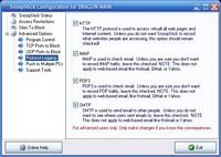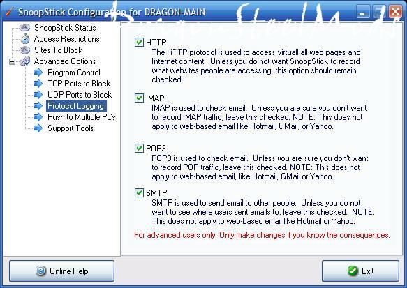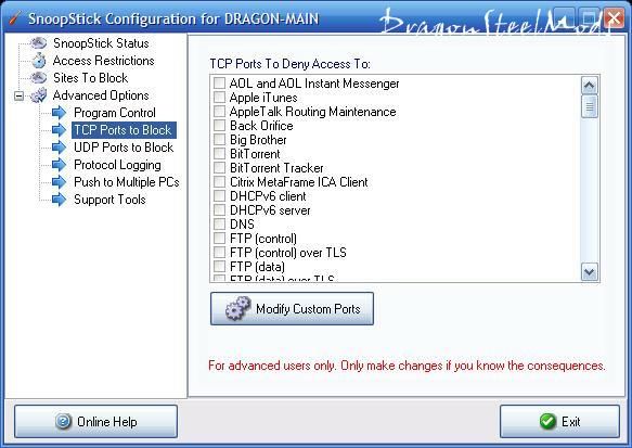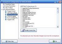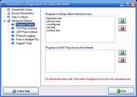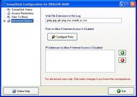 The last menu is the advanced options configurations, here you can select things to not be included in the logs. Here you can also allow certain IP Address internet access even if SnoopStick has access turned off, like Windows Update, or your Anti-Virus software sites. You can also configure ports manually that will be allowed access.