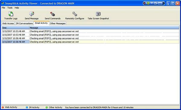 Once open you have access to quite a bit on information about the computer you are monitoring. Across the top you’ll see some icons, the first one is ‘Transfer Logs’, with this option you can transfer logs remotely from the monitored computer to you SnoopStick. The next option is ‘Send Message’, kind of obvious, you can send a message to the machine you are monitoring, if you catch them doing something they are not supposed to do you can instantly let them know. The next option would be ‘Send Commands’, another obvious one, you can send commands to the machine you are monitoring, like disable internet access instantly. The ‘Send Commands’ option is pretty cool as well, you can shutdown a machine remotely, log users off, restart the machine, disable/enable internet and configure times for internet access. Next up is the icon ‘Remotely Configure’, this is another self-explanatory one as well, this will allow you to configure the remote SnoopStick software. The icon is ‘Take Screen Snapshot’, this one is actually cool, it will take a full desktop screen shot of the remote computer to show you exactly what they are doing and accessing at that moment.