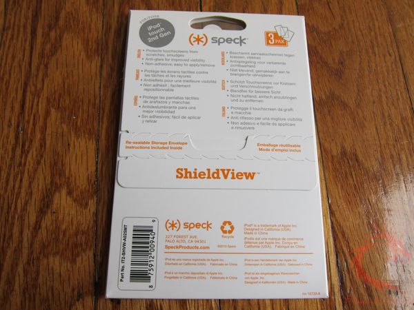 The Speck ShieldView for iPod Touch/iPhone comes in a set of three static cling films that feature an anti-glare matte finish. They can be easily applied and removed without any residual adhesives or goo.