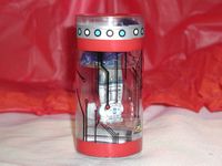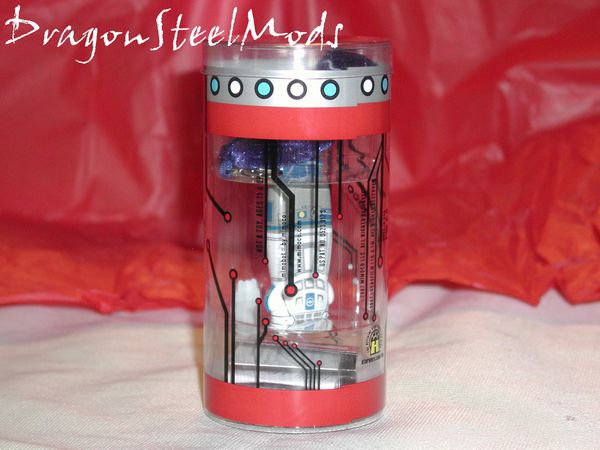 The package has a technological look and feel to it, with what look like circuits around it. You can see R2-D2 right through the container, and they made it so he is sort of hovering in there.