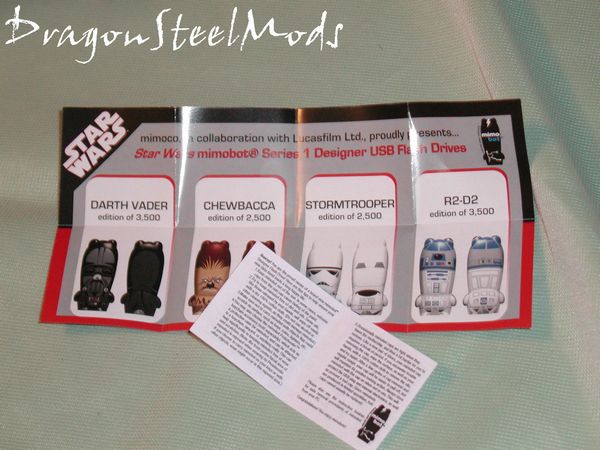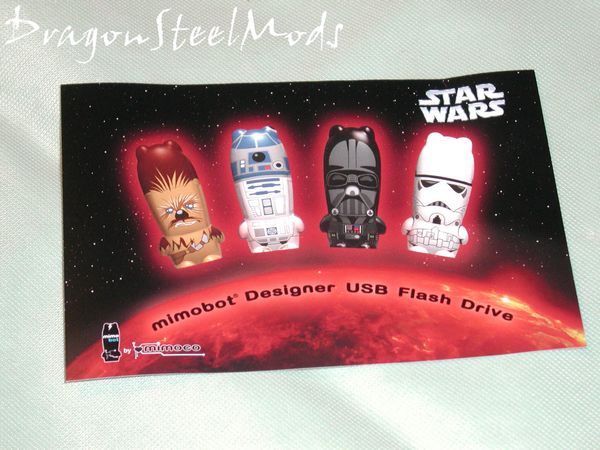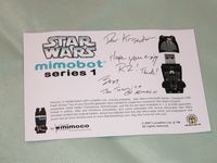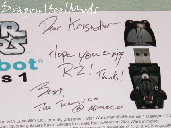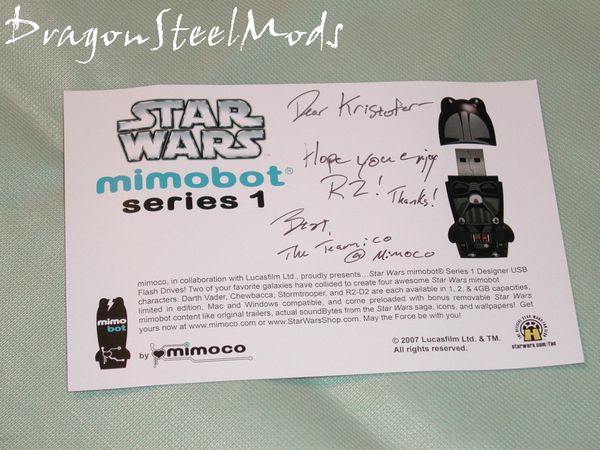 They included a postcard type advertisement, the front side features the Star Wars mimobots, while the back side features a bit more about them and a personal note to me from mimoco.