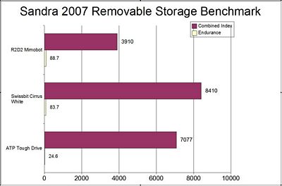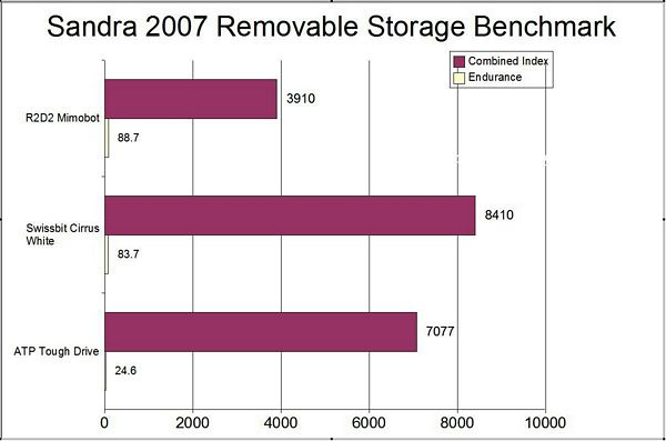 Next up I went with SiSoft Sandra 2007 Removable Storage Benchmark and compared the same drives. Higher is better of course for all scores.