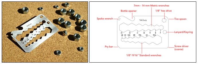 Lucy – Righty tighty, lefty Lucy! Tighten a bolt with an expanded collection of common metric and standard wrenches, straighten a rim with the spoke wrench, hold a 1/8" hex bit, turn an idle screw on a carburetor, pry open a paint can or open a bottle. For bikes, cars and all types of machines, Lucy is designed to be garage and road-ready.