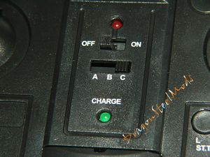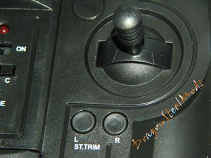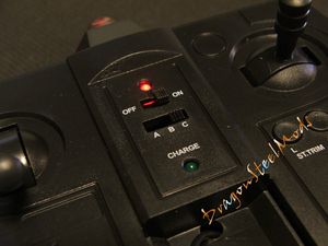 The remote has two joysticks, one on the left and one on the right. The right stick controls left/right movement and under it is where the trim buttons are located. In the center of the remote is the channel selector switch, on/off switch and power/charge LED indicators. The left joystick controls power to the motor to control height and forward movement.