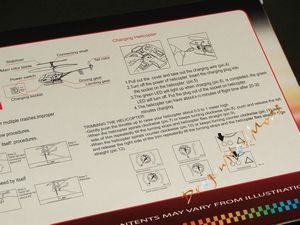 The first thing you’ll need to do besides putting batteries in the remote is to charge your helicopter, this take about 25 minutes to give you about a 10 minutes flight time. I got about 12 minutes, and it only took about 20 minutes to charge it with new batteries.