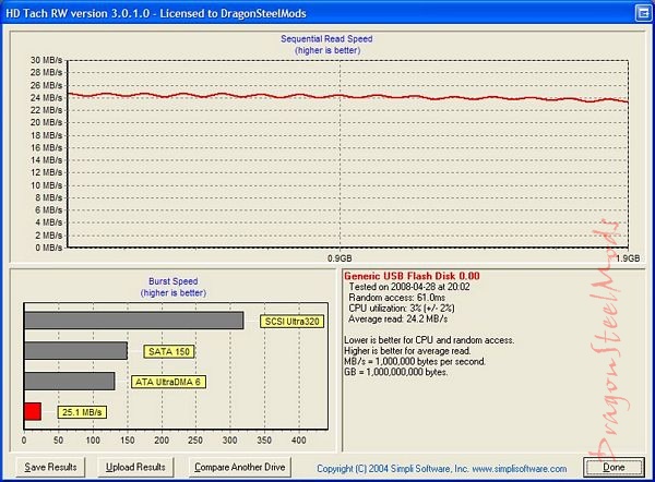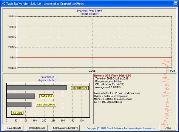 For testing, I used a six foot Cate5e cable. To measure transfer speeds, I used my trusty OCZ Rally2 2GB drive and HDTach RW. I connected a printer, keyboard/mouse combo and the USB drive. From the HDTachRW test (the first table is the OCZ plugged directly into the PC, while the second table is through the adapter); we will notice that the USB 2.0 Extension Cable to Cat5e or Cat6 Extender Adapter has USB 1.1 speeds for data transfer. Oh, well. This should not hamper devices such as printers or mice/keyboard combos, but it will slow things down if used as an extension for some form of storage device.