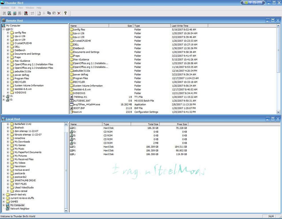 Once you have both computers connected you can double-click the Thunderbird icon and up will pop an Explorer style window that is split in the center, the top half is labeled ‘Remote Host’ and the bottom ‘Local Host’. I connected my laptop up to my main computer and through Thunderbird I can easily navigate my laptops hard drive to transfer data to and from it. This of course looks the same, but reversed on my laptop and the same idea applies.