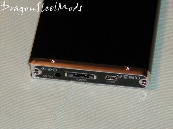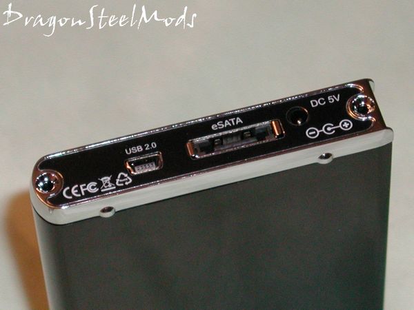 The back end is where you insert your 2.5 SATA hard drive, and this is where all the connections are located. USB2.0, eSATA, and a power connection if needed, but oddly Vantec does not include any type of power supply, you have to have one to use the NexStar3 in eSATA mode.