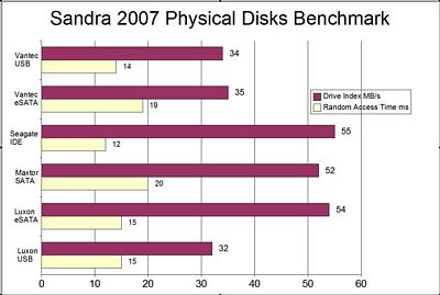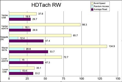 First up is the HDTach RW Benchmark. I also included a standard IDE and SATA drive as well for comparison in addition to the Vizo Luxon eSATA enclosure.