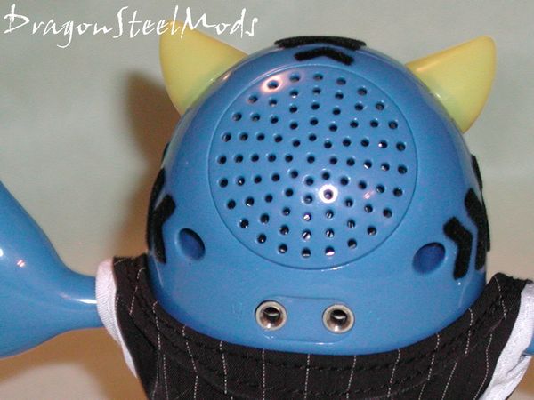 Here’s a couple close up shots of Slicks’ head, you can see the fuzzy hair, and a closer look at the mic and headphone jacks along with the speaker.