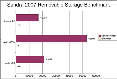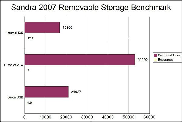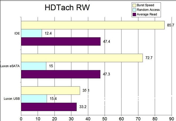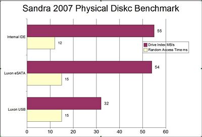 I ran tests on the speeds of this drive, using the standard IDE interface direct to my motherboard, the Luxon eSATA interface and the Luxon USB interface. For testing I used SiSoft Sandra 2007 and SimpliSoftware HDTach benchmark software.