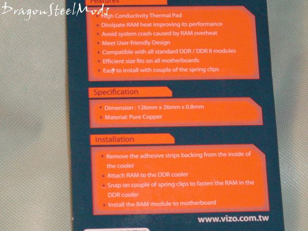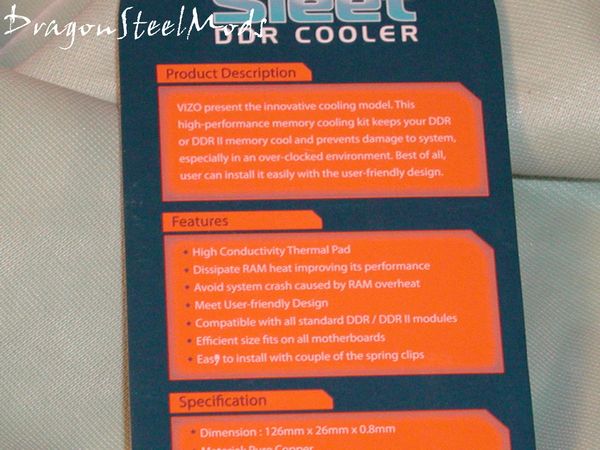 VIZO present the innovative cooling model. This high-performance memory cooling kit keeps your DDR or DDR II memory cool and prevents damage to system, especially in an over-clocked environment. Best of all, user can install it easily with the user-friendly design.