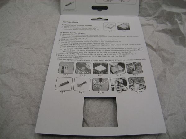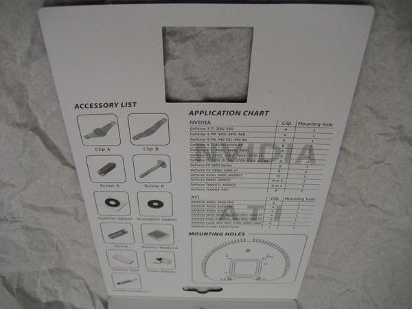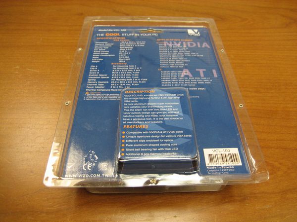 The packaging is a plastic clam shell design resting on a blue card with a Vizo logo. The card doubles as the instruction sheet when folded open. The package prominently features the fan, the clips and the ramsinks. In a small square attachment, all the additional parts can be found.