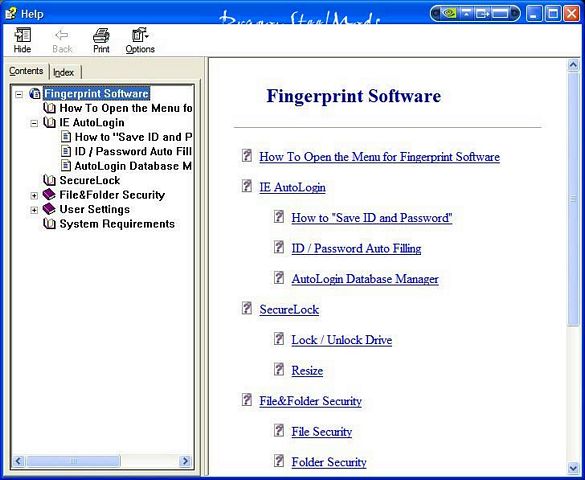 On the main menu is also the same option to access the Help manual, and there is also another selection that is called ‘User Settings’, which as the others when highlighted open a sub-menu with more options. From the User Setting menu you can rescue your password, register more fingerprints, change the windows logo settings, change screen saver lock and the auto hide settings of the quick bar, or main menu. The Windows logo settings are for changing it so you can access Windows with just your fingerprint so when the computer starts and you get to the logo screen where you would enter an id and password you won’t have to, you just swipe your fingerprint and your in. You can also set the screen saver as well to lock your computer, and only be unlocked with a swipe of your fingerprint.