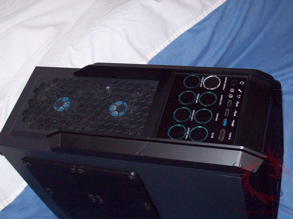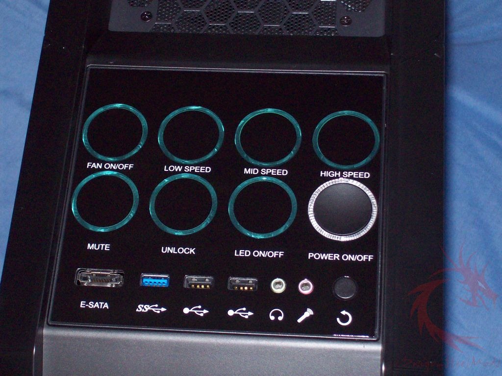 On the top near the front you’ll see one of the big features of the Touch 787 and where it gets its name from, the touch panel which has eight buttons for controlling the fan speeds and the lighting along with a mute and lock button. You can turn the fans and LEDs in the fans completely off if you want. Below the buttons you’ll find two USB 2,.0 ports, a USB 3.0 port, an eSATA connection, audio jacks and a reset button.