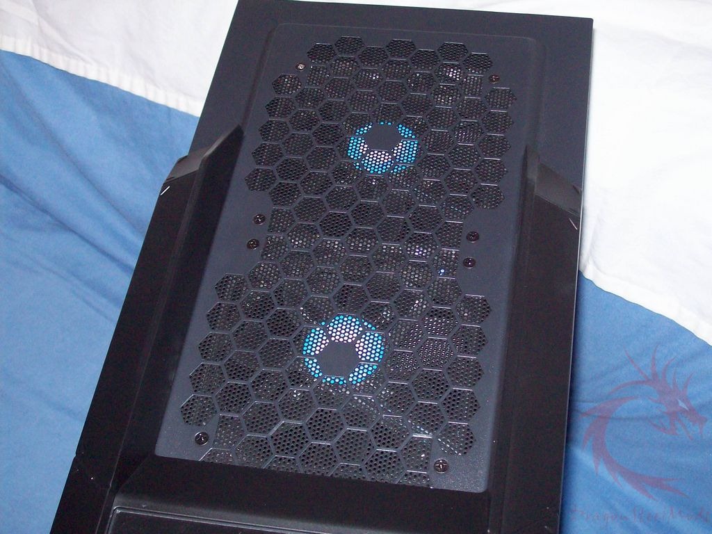 Then here’s the top of the case. As I mentioned it’s plastic like the front, and the the front panel is raised higher than the two top fans making for a unique look.