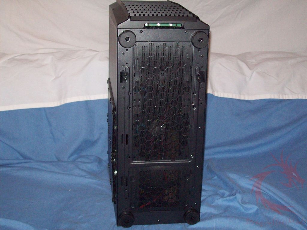 The Touch 787 has a bottom mounted PSU and plenty of holes for optional water cooling ready for you. The side panels are held in place with thumbscrews for easy access.